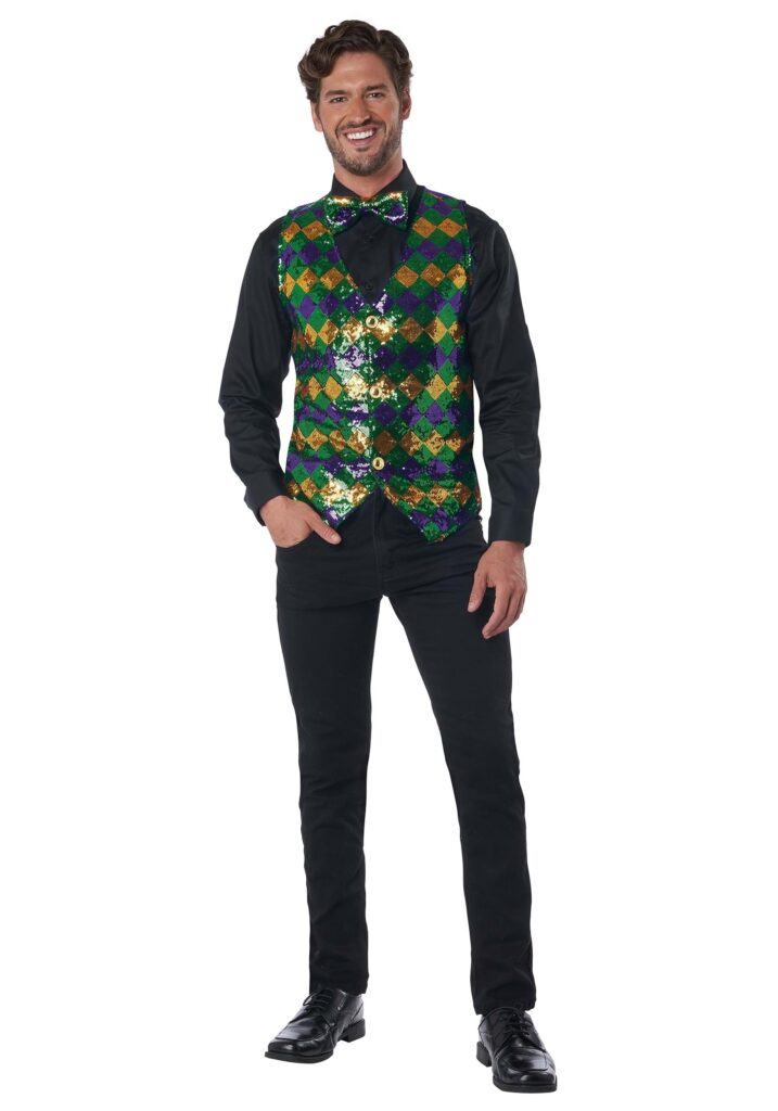 Enjoy Carnival in style when you wear your Sequin Carnival Vest Set for Men! The polyester satin vest fastens with gold-tone plastic buttons, and the front features a pattern of gold, green, and purple diamond shapes made entirely out of sequins. You can adjust its fit to your liking thanks to the ribbon waist ties. The matching sequin-bedecked bowtie has an elastic neck band to keep it in place while you celebrate. Good Times Are Here.
