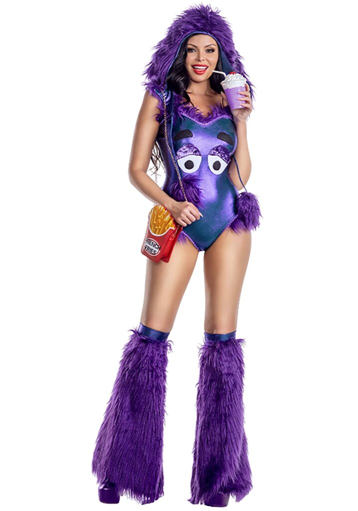 Shake Up Your Halloween Look The Sexy Purple Grim Milkshake Monster Costume is here to shake things up in the most fun and funky way! If you’re ready to turn heads while channeling a lovable (and slightly mischievous) purple monster, this costume has everything you need. From the furry leg warmers to the playful milkshake prop, you’ll be the talk of the party with your deliciously unique style.This isn’t your typical monster outfit, it’s a fierce and flirty take on a fan-favorite fast-food mascot! With bright purple faux fur and a playful design, this costume perfectly blends quirky and sexy. Whether you’re hitting up a costume party or adding some extra flavor to a Halloween bash, this milkshake monster will have you looking both fun and fabulous. Don’t forget the fries (seriously, the purse is a bag of fries)!