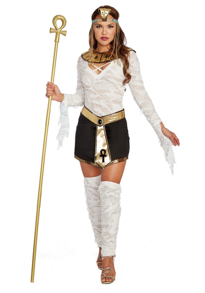 Product DetailsMake a regal entrance to your next costume party with this Women’s Sexy Mummy Dearest Costume. Sure, you want to dress like a mummy, but it’s difficult to show off your lovely legs and pretty face if you’re covered head-to-toe in bandages! We think this costume is the perfect compromise… a modern twist on a vintage classic, if you will. The costume comes with a bodysuit, skirt, collar and pair of leg warmers. The white tattered bodysuit has long, trailing sleeves and a criss-cross neckline with a gold statement Egyptian collar. There’s also stylish black mini-skirt (you didn’t know Egyptian royalty wore mini-skirts, did you?) to wear over the bodysuit–or not, your choice. The costume comes with a pair of off-white footless thigh high leg warmers.Walk Like an Egyptian…And party like one, too, in this fabulous costume!