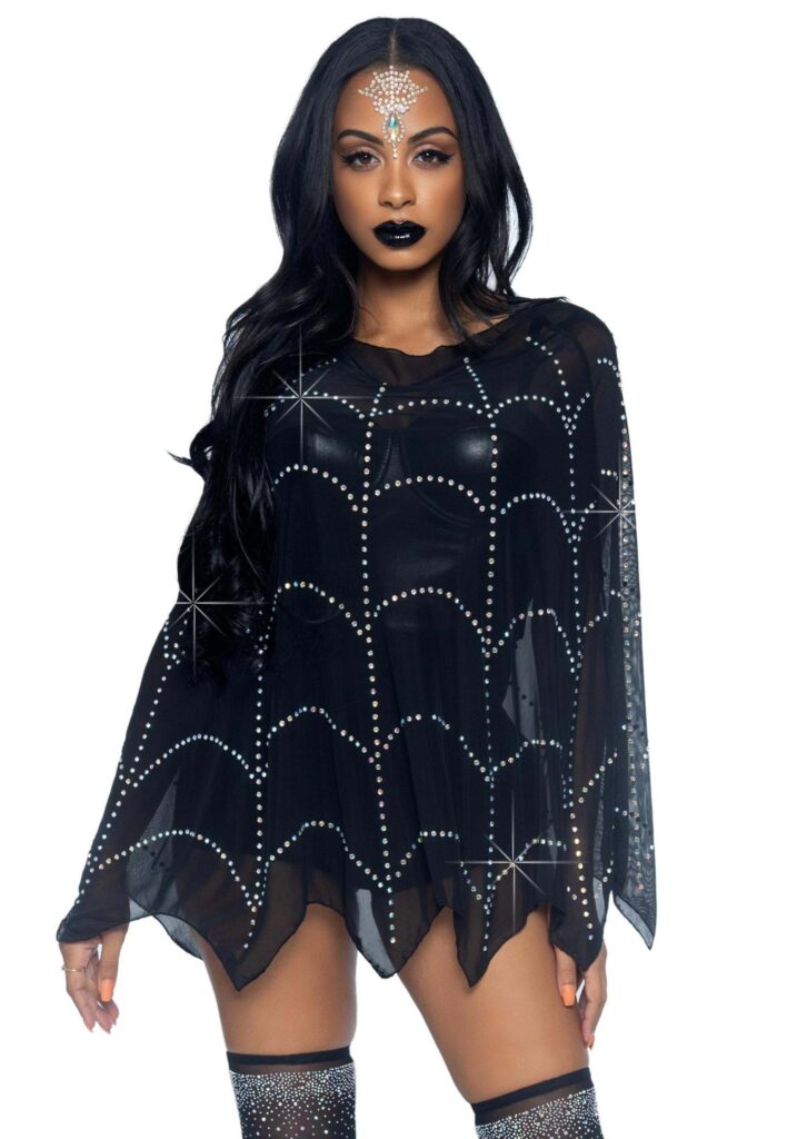 Web DevelopmentIt is hard for nearly everyone to find the right career path for themselves. Everyone wants to work in the Halloween costumes business, but unfortunately, not everyone can handle being in such a high-profile and prestigious line of work. Finding your path in life is such a hassle that it is tempting to wish that your life plan was laid out in front of you, like the olden days when the children always worked in the family business.Well, that is not only true of humans! Animals also have to make their own way in life, and that can lead to a lot of consternation. Luckily, spiders have it all figured out from the get-go. They are either going to be in pest control, tailoring, or web development. What a blessed existence it would be to just know that you will be hanging out on the web all the time!Rhined with StoneStill, we have to thank all the tailor spiders who made this Sheer Rhinestone Spiderweb Poncho for us. They did fine work creating the web patter with beautifully glinting and refracting stones. That sparkle, inspired by morning dew drops on a strong web, is just the extra style that will take your costume to the next level.You Arach-need This!If you are looking for the perfect way to add some dazzle to your outfit, then this is the thing for you. This poncho is comfy and sleek, with just the right mixture of monstrous charm and sheer style!