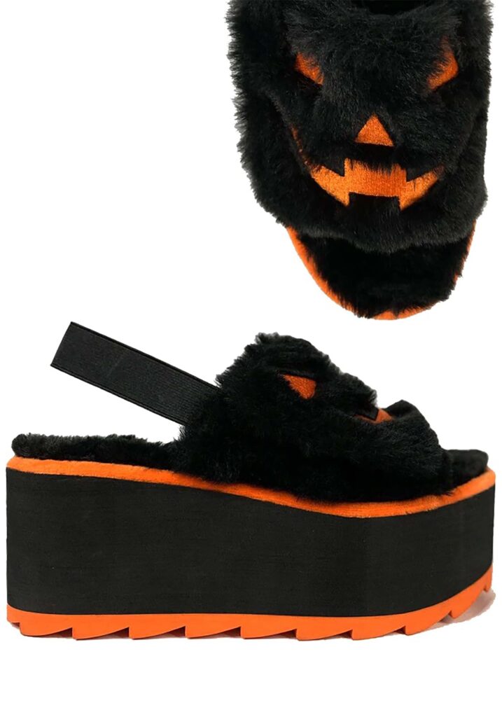 Have frightfully cute feet when you wear these Lily Jack Sling Back Platform Sandals! The stylish shoes have thick platform soles made of black EVA vinyl with elastic heel straps to keep them securely in place. Faux fur uppers keep your toes toasty warm and super comfortable. Orange trim complements the embroidered jack o’ lantern faces that grin toothily from the top of the adjustable slides. Haunting Holiday Nothing says Halloween like a smirking pumpkin. These shoes are so fun, they might be the only ones you wear during the entire month of October.