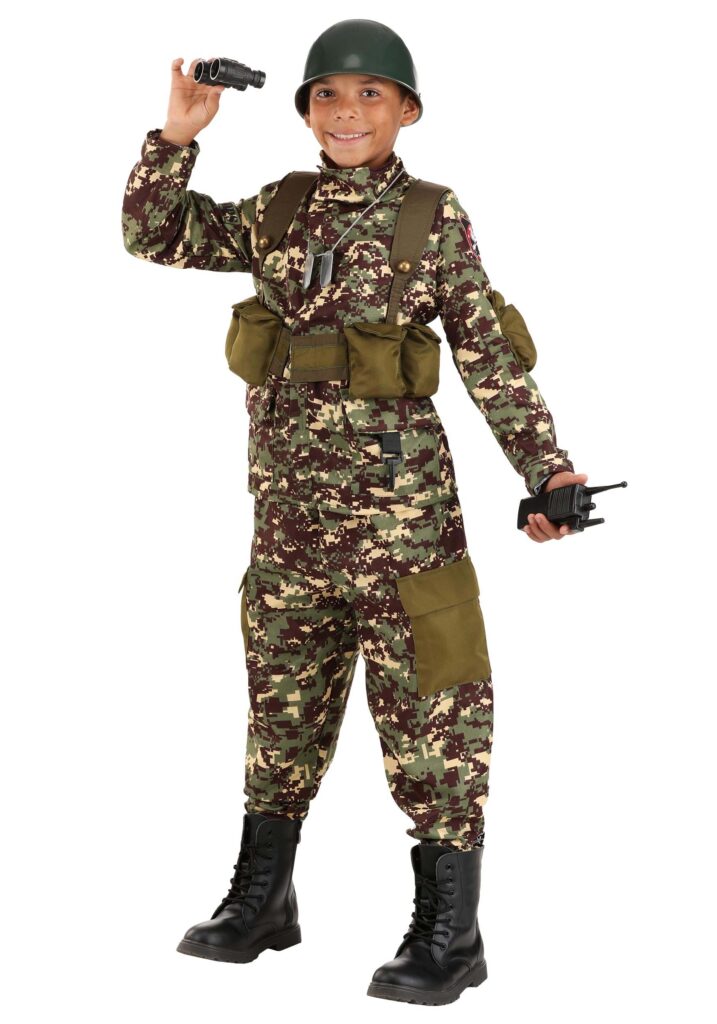 Product DetailsYour mission is to have fun when you wear this Soldier Prestige Costume for Kids! The unisex outfit includes a long-sleeved camouflage shirt with a sewn-on utility belt harness that features four useable pockets complete with flaps that close with hook & loop fastener. The left sleeve has a printed patch reading “Hero Squad.” The pants have two olive utility pockets sewn to the outside of the legs. Add the silver-tone dog tags and the plastic tactical helmet! Ready for ActionIf you want to have an amazing group costume, get your friends together and form your own platoon! Name it something cool and decide on some team drills for trick-or-treating this year. Otherwise, get your binoculars, prop weapons, and combat boots and be an army of one. The neighborhood is safe with you on patrol. You’ll probably have to let a few people know that you’re not “spying” – you’re conducting surveillance and that it’s very important for gaining critical information in the army.