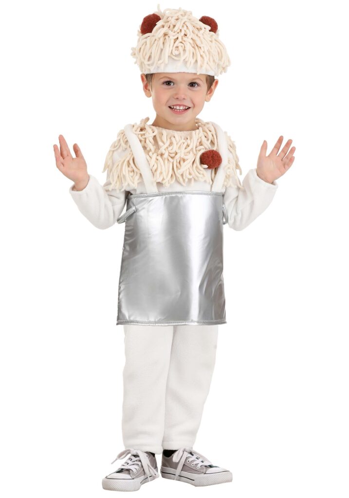 Your little one will love transforming into their favorite food with the help of this exclusive Spaghetti Costume for Toddlers! The costume jumpsuit is white fleece decorated with a froth of cream-colored chenille “noodles” hanging down from the neckline. A red and brown pompom meatball is attached to the left side of the chest. The slip-on silvery tunic is round like a pot and has fabric “handles” attached to each side. The chenille noodle-covered hat with its pompom meatball toppers is the perfect garnish. Dinner Is Ready!  Your sticky, saucy toddler’s noodle-crusted shirt could be seen as a mess (and yes, it qualifies), but it also could be seen as inspiration. After all, the best costumes frequently are inspired by everyday life. However, if you’re a little grossed out by the idea of sending your kid trick-or-treating with dried sauce crusted on his shoulder, try getting this costume instead. It’s adorable, funny, and best of all, doesn’t require being treated with stain-removal spray after use.
