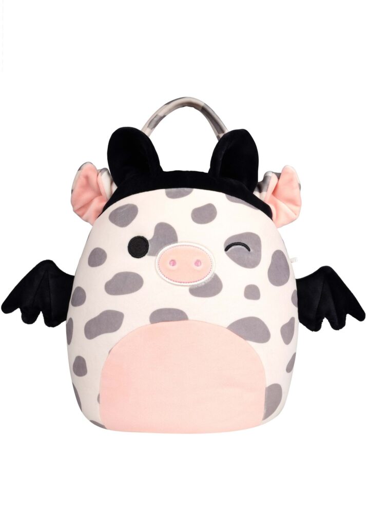 This plush treat pail is shaped just like Rosie the Pig, reimagined for Halloween with a gray-and-white spotted body, pale pink belly, and embroidered winking face. Black bat wings and ears give her a playful spooky twist, while her signature pig snout keeps her unmistakably Rosie.A small carry handle on top makes it easy to tote from door to door, and the lightweight construction ensures it’s comfy to carry all evening. As an officially licensed Squishmallows accessory, it’s just as collectible as it is functional.Bat Pig to the Rescue.