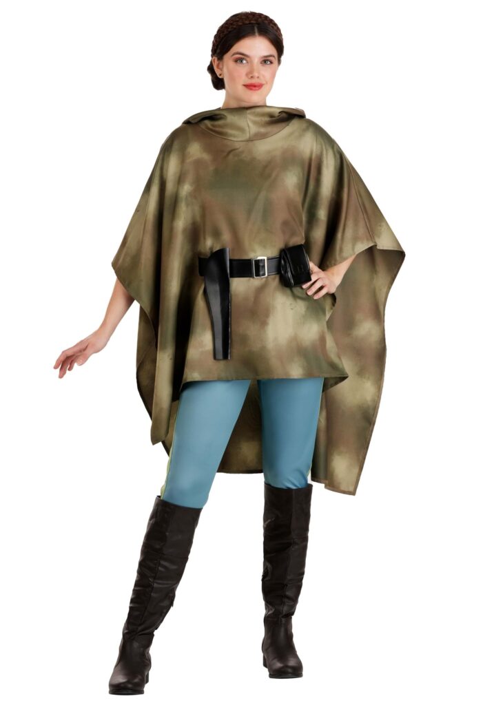 When the Rebellion sets its sights on dismantling the Empire’s new Death Star, Leia is ready to join the fight, even if it means venturing into the uncharted wilderness of the forest moon of Endor. This wasn’t just another mission; it was the mission. Leia volunteers for the strike team without hesitation, ready to go boots-on-the-ground.Of course, a lush, green forest moon calls for some serious tactical gear, like a camouflage poncho that’s perfect for both blending in and looking fierce. From dodging trees and stormtroopers at breakneck speed to an unexpected alliance with the Ewoks, our Leia Endor Battle Costume is going to put you right into the heart of the action!