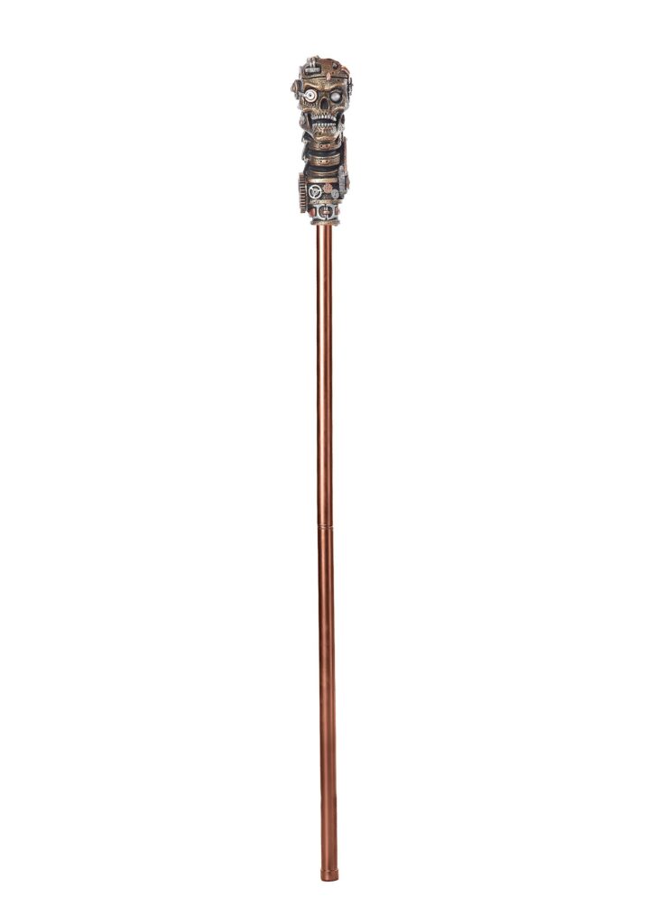 Every dream requires a dreamer. Maybe that’s why this detailed Steampunk Cane features a molded plastic head that looks an awful lot like a metallic skull, churning through fantastic ideas with the help of all those gears! Because even though we tend to think of a steam-powered retrofuture as a pretty great place to visit, nowhere is perfect. Buried under the gleaming machinery of all those clever contraptions, we’re sure that there’s at least a hint of the darkly-obsessive or macabre.That’s just the way that stories go: if the hero is a gifted but naive up-and-coming engineer, there’s got to be a villain to balance the scales. So whether you’re an earnest tinkerer who’s lost himself in a mechanical labyrinth of his own brilliant inventions, or you’re the diabolical mastermind who’s built a dark secret into the turbine-driven heart of a floating city, this cane is a solid choice when you need somebody to lean on!