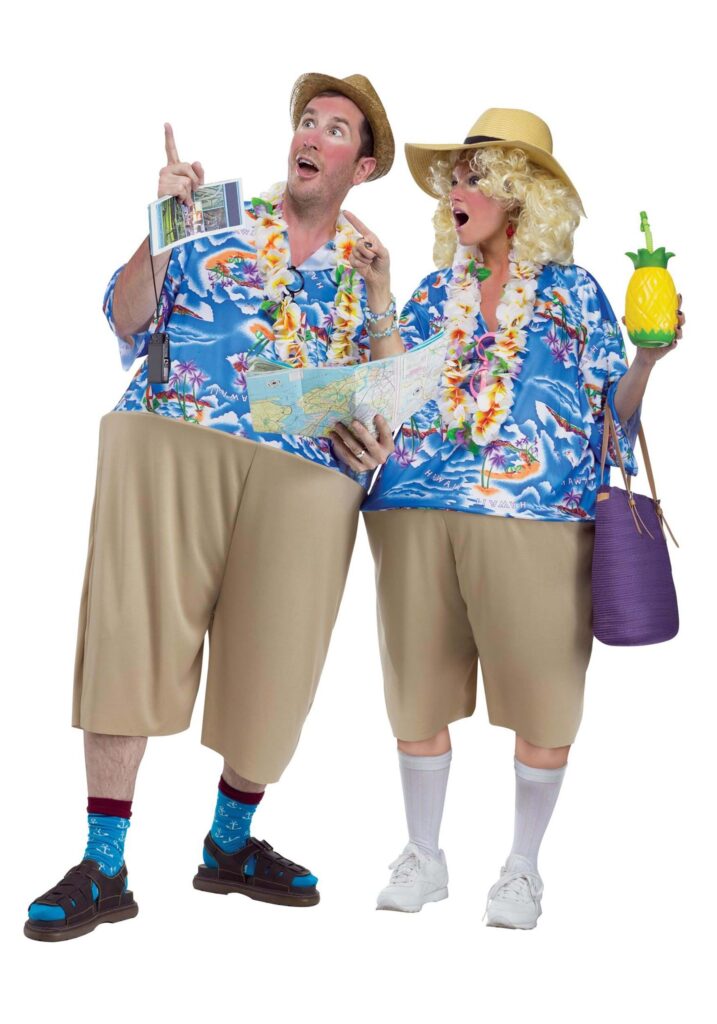 Product DetailsLet’s break this down because there’s a lot going on here, and all of it is fantastic. First, this costume is a jumpsuit designed to look like the quintessential tourist who took the “vacation wardrobe” advice way too literally. The top is styled as a Hawaiian shirt with blue, gold, and purple patterns, because why not make your shirt look like it got into a fight with a tropical drink and won?The shorts are a classic tan, because every tacky tourist knows that nothing screams “I’m on vacation” like tan shorts. But the real amazing part of this outfit is the plastic hoop in the middle of the costume. Perfect for the Tourist at HeartThis Adult Tacky Tourist Costume is for the person who wants to take the art of vacationing to new, exaggerated heights. Whether you’re headed to a costume party, a Halloween bash, or just want to make everyone laugh at your next Zoom meeting, this outfit is a guaranteed crowd-pleaser. Just don’t be surprised if people start asking you for directions to the nearest tiki bar.