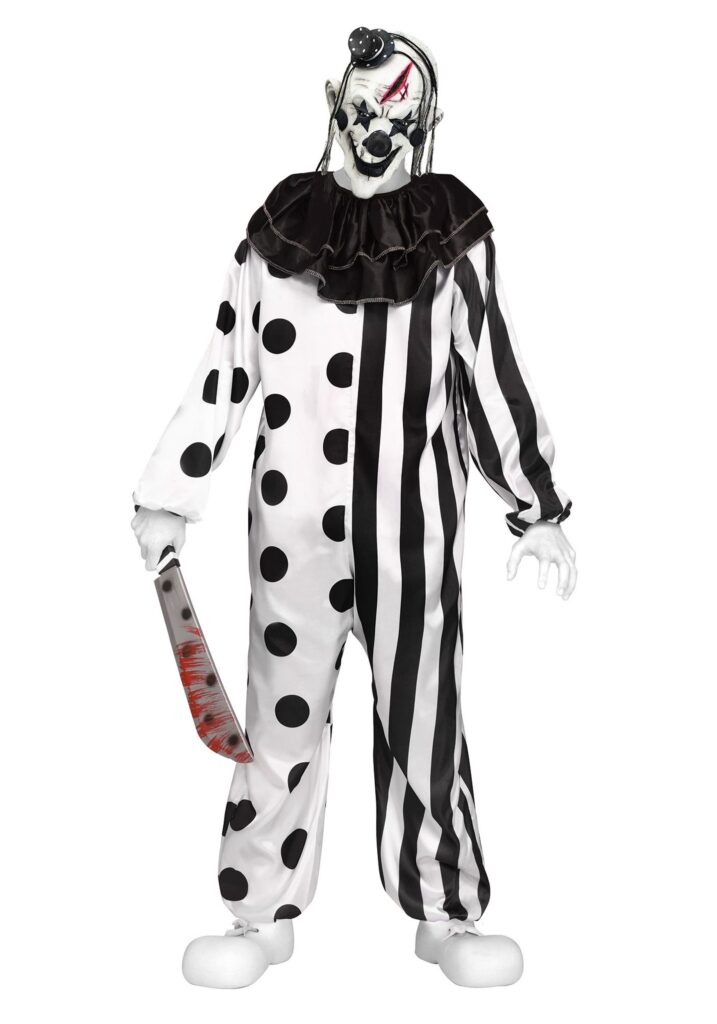 Crafted from sleek 100% polyester material, this costume provides both comfort and a creepy vibe. The jumpsuit’s hook & loop fastener at the center back ensures easy wear, while the elastic at the wrist and ankle cuffs gives a snug fit, adding to the ensemble’s sinister flair. The ruffled collar, which ties effortlessly, enhances the eerie factor. The highlight is the molded latex mask, covering the entire face and top of the head, featuring a chilling clown face, complete with attached wild hair and a mini top hat. This mask is truly the stuff of nightmares, making it a standout piece in any dark circus theme.Dark Circus Delight.