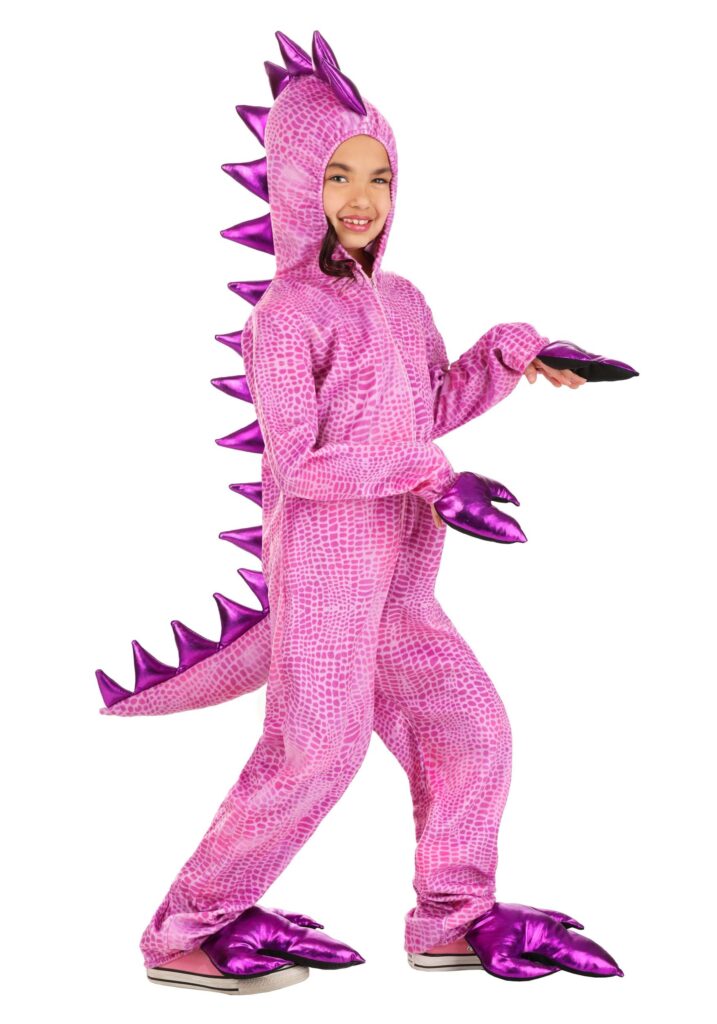 Become an apex predator when you wear this exclusive Terrific T-Rex Dinosaur Kid’s Costume! The jumpsuit zips up the front and is made of light purple plush that’s printed all over with a darker purple scale pattern. Its longs sleeves end in shiny purple hand covers, and a pair of matching, stuffed foot covers are attached to each ankle opening. A row of shiny, soft-sculpted purple spines marches from the top of the costume’s attached hood all the way down to the tip of the stuffed tail sewn to the jumpsuit’s seat. Modern-Day Marvel.