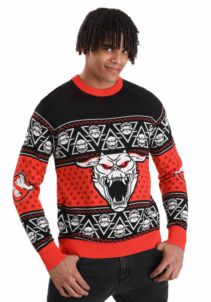 This officially licensed pullover sweater features an all-over knitted design with a pattern of snarling terror dogs, No-Ghost logos on the elbows, and a giant glowing-eyed face of Gozer’s favorite hellhound right on the chest. The red and black palette gives it a bold, supernatural vibe that says “Happy Holidays” with a side of spiritual disturbance.Constructed with a blend of acrylic and cotton for the shell, and rib-knit accents on the cuffs, waist, and neckline, it’s equal parts comfort and chaos-adjacent menace (but, like, cozy). The red LED eyes are embedded in the knit and powered by a hidden battery pack, letting you glow ominously at any holiday function, office party, or interdimensional summoning circle.Sweater Busters.