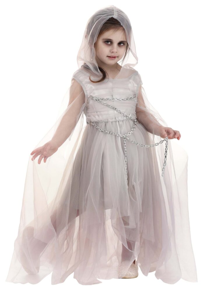 Crafted from 100% nylon, this dress is as comfortable as it is enchanting. The poly gauze pullover design, complete with an attached sheer hood, ensures your little ghost is draped in supernatural style. The satin skirt and top, combined with the lycra fabric back and long sheer sleeves, add layers of ghostly allure that are perfect for a night of spooky fun.The elastic waistband on the back ensures a comfy fit, so your child can flit around effortlessly. A plastic chain attached to the front gives just the right touch of supernatural detail, making the whole outfit come together in a way that’s spooky yet stylish. And because it’s exclusively Made By Us, you know it’s designed with quality and care.Sweet and Spookified.
