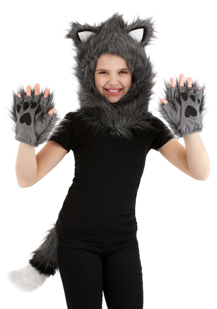 Product DetailsUnleash your inner wolf by wearing this exclusive Wolf Hood, Hands & Tail Costume Accessory Kit! The set includes a faux fur hood with soft, standup ears. It matches the long faux fur tail that can be fastened through a belt loop or hooked through a sash. The faux fur fingerless gloves have black appliqued wolf pad details on the palms. A Howling Good Time Create your coolest and easiest Halloween costume ever with this fun accessory set! You’ll look amazing and – bonus! – you’ll be totally comfortable, since you can wear it over a cozy outfit. Even real wolves would approve.