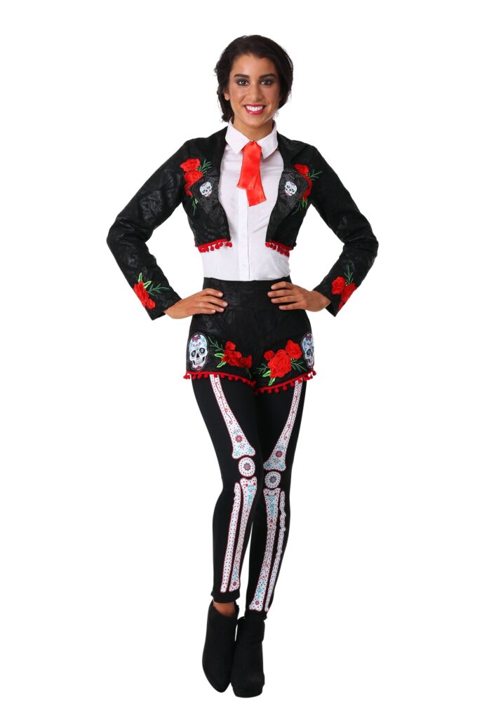 Mariachi MavenWhat do you do if you’re a stellar musician at a Day of the Dead celebration? You go all out, of course (come on, you know who you’re talking to!), and make some mariachi magic. In order to participate in the festivities, you’ll want a costume that honors the traditions and customs of the holiday. For a celebration of life and death, this look is both lively and…well…skeletal! It’s our Women’s Day of the Dead Mariachi costume, and it’ll keep you cool, calm, and calaca whether you’re performing for the masses or just enjoying the show!Your ancestors will definitely approve of this well-tailored look that nods to your musicianship and makes you as memorable as they are! It’s a mariachi-inspired jacket and shorts combo that asks for only the spirit of celebration to be complete (not to mention the signature makeup).