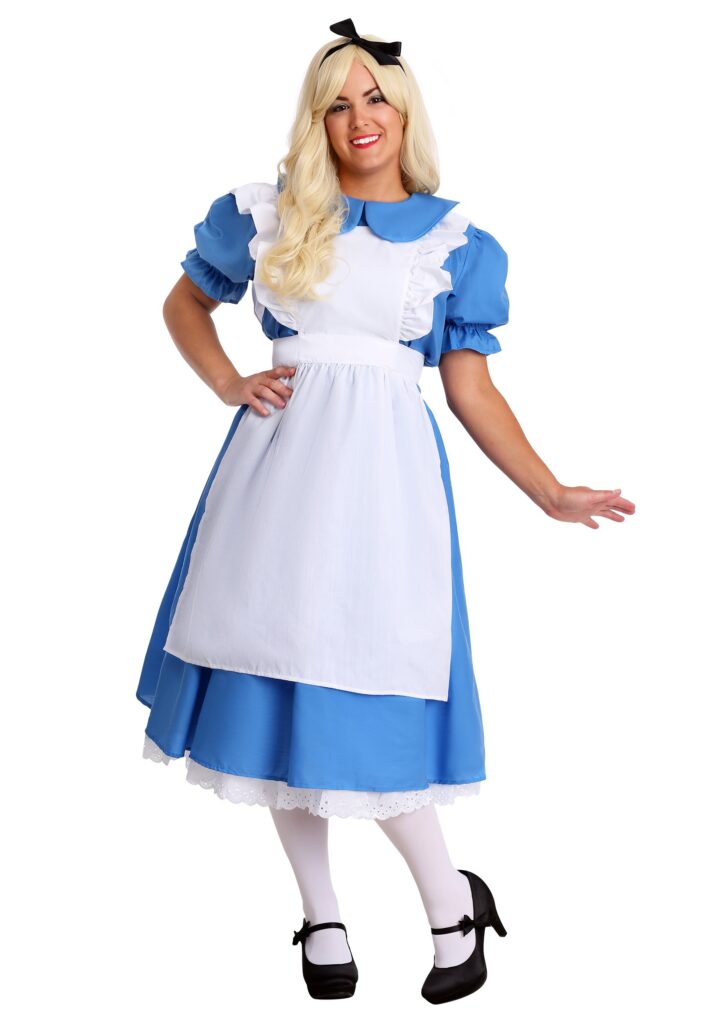 It’s a lovely day for a stroll through Wonderland, wouldn’t you say? Since the answer is always yes, the real question is what would be the perfect costume to wear on your journey? When you slip into our exclusive Deluxe Plus Size Alice Costume, you’ll be the sweetest looking traveler in any land! The best part about spending the day in a place like Wonderland is that you won’t have to pack very much to take with you. There are always plenty of lovely drinks and cakes just laying around and up for grabs, so you won’t have to bring any refreshments (and if you can’t find anything to snack on, we hear the mushrooms that sprout there are so delicious, you’ll think you’re changing sizes). And you won’t have to bring anything for entertainment, either, since if you get bored, you can play a rousing game of flamingo/hedgehog croquet at the Queen of Heart’s castle (just don’t get caught! ). And you can always drop by the Hatter’s place, where it’s always tea time! Whether you’re in Wonderland, of just love looking like you are, this classically looking dress is the only outfit you’ll need, too! The ruffled blue dress and matching hair ribbon is a style lifted right out of a fairy tale, and the apron adds a lovely farm girl flair. Complete this magical ensemble with a petticoat, and a pair of tights and baby doll shoes, and you’ll be ready for your journey down the rabbit hole!
