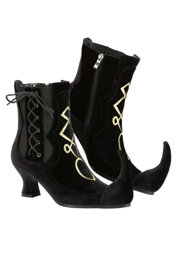 These faux suede boots feature a classic curled toe to replicate Winifred’s shoes. Metallic gold embroidery adorns the front while the side panel showcases decorative faux vinyl grommets and waxed laces, all while ensuring a stylish fit with an easy zipper closure. Inside, a dark turquoise insole printed with the Hocus Pocus logo brings an extra dash of Disney charm.©Disney