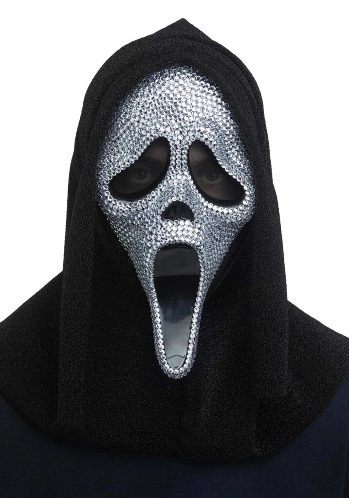 This molded plastic mask features the iconic Ghost Face design, complete with the elongated mouth, sunken eyes, and a whole lot of attitude. But this time, it’s fully covered in shimmering rhinestones, giving it a look that’s more red carpet than back alley, though you can absolutely use it for both.The mesh-covered eye holes allow for limited vision while keeping your stare concealed. A black cloth hood is attached, finishing off the look and helping you disappear into the shadows when the spotlight gets boring.Sparkle With Intent.