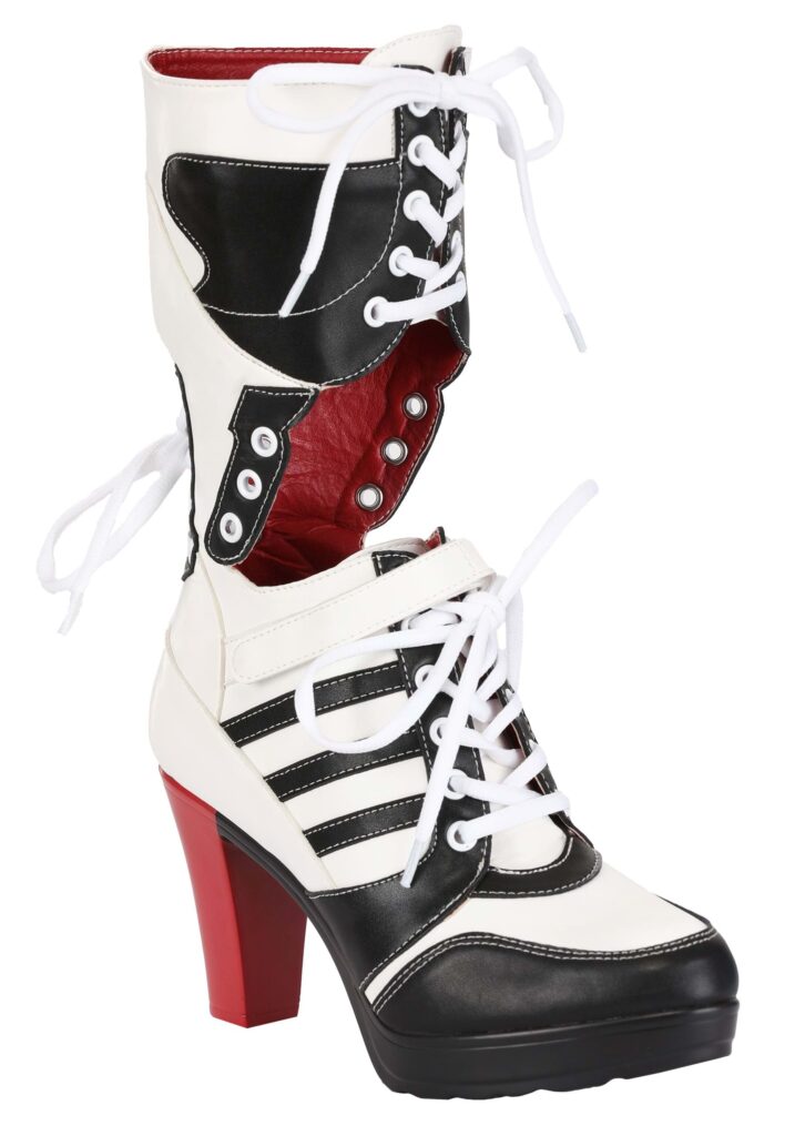 Thanks to these exclusive Harlequin High Heel Boots for Women, your outfit will be as legendary as your origin story! The high-heeled boots are made of red, black, and white faux leather. The high boot shafts have a cutout in the front and lace up over the arch, above the ankle, and around the calf. Bad Guys, Great Shoes Where will these boots take you? Will they lead you to a costume party, or inspire you to face off with the annoyingly goody-goody defender of your metropolis? We’d pick you to win against any hero, any day. We’re positive that the “good guy” doesn’t have shoes nearly as amazing as yours.