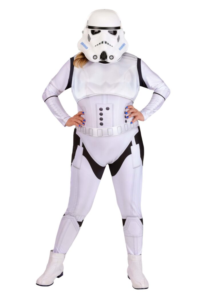 This plus-size costume includes a stretch jumpsuit made from a spandex-blend material that flexes and fits comfortably. It’s printed with the classic black-and-white armor details, so you’ll look ready to march the corridors of the Death Star (or just your living room) without the bulk of traditional armor.The molded chestpiece fits over the jumpsuit with elastic straps for a secure but breathable fit. The coordinating belt fastens at the waist with a hook and loop closure, and a molded half mask completes the look with that signature Stormtrooper helmet front. It’s just enough for photos and fun without needing a full helmet. And yes, the garter is included and fully designed with Imperial dress code in mind.March to Your Own Theme.