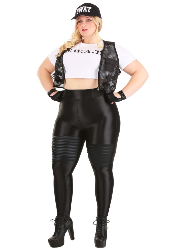 Product DetailsSay hello to a blend of style and authenticity with this 100% polyester plus-size women’s SWAT Officer Costume designed for our fierce plus-size elite. Slip into a stretchy jersey knit shirt boldly stamped with “SWAT”. Complement it with moto leggings featuring a secure, wide elastic waistband for ultimate comfort. The mesh vest has a zipper down the center, two functional pockets, and dual parachute buckles.Slide on the vinyl fingerless gloves, equipped with hook-and-loop fasteners for a snug fit. And let’s not forget the final touch: a black hat proudly displaying embroidered lettering, adjustable to your liking. Oh, and a bonus? This look is exclusive, just like the SWAT team. So, gear up, take charge, and let your SWAT spirit shine this Halloween with our women’s plus-size costumes!Special Ops SwaggerWhether you’re hitting the Halloween scene solo or with a team of fellow officers, our Plus Size Women’s SWAT Officer Costume is bound to make an impression. Prepare for the world of Special Weapons and Tactics, and rock that SWAT team costume like the night depends on it!