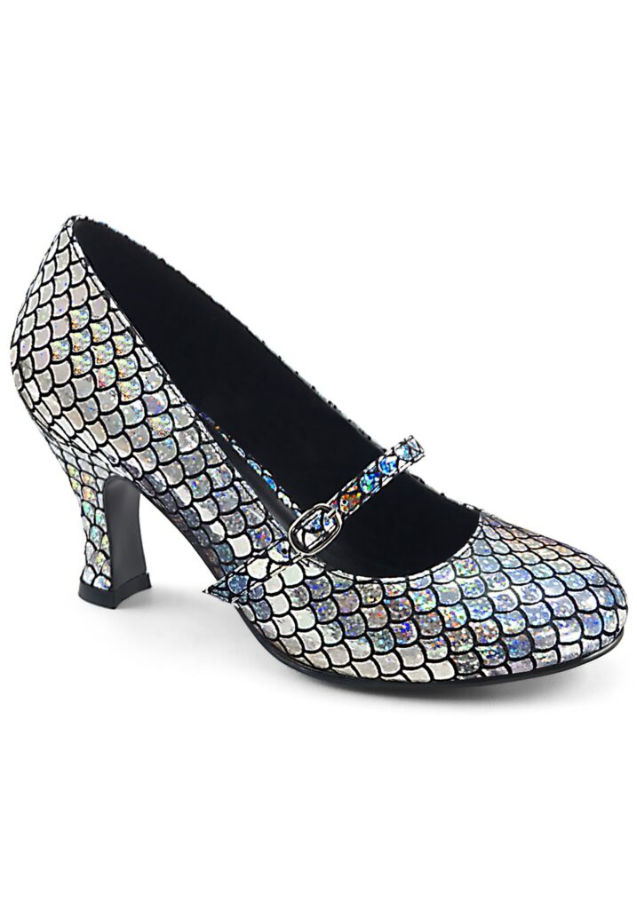 Product DetailsIf you’re a mermaid who is looking to prance around on a pair of legs, you can at least keep some of that aquatic style with these Silver Mermaid Heels. These faux leather shoes have a comfortable sole and raised heel for height, though the thing that makes them magic is the reflective scale pattern that’ll look just magical.BUCKLE IN FOR FUNRemember to keep your magical look while treading through the surface world instead of treading water. With these Mermaid Heels, you’ll be able to keep kicking that mermaid look even if you’ve given up the mermaid tail. Who knows, perhaps you can do both at once!?