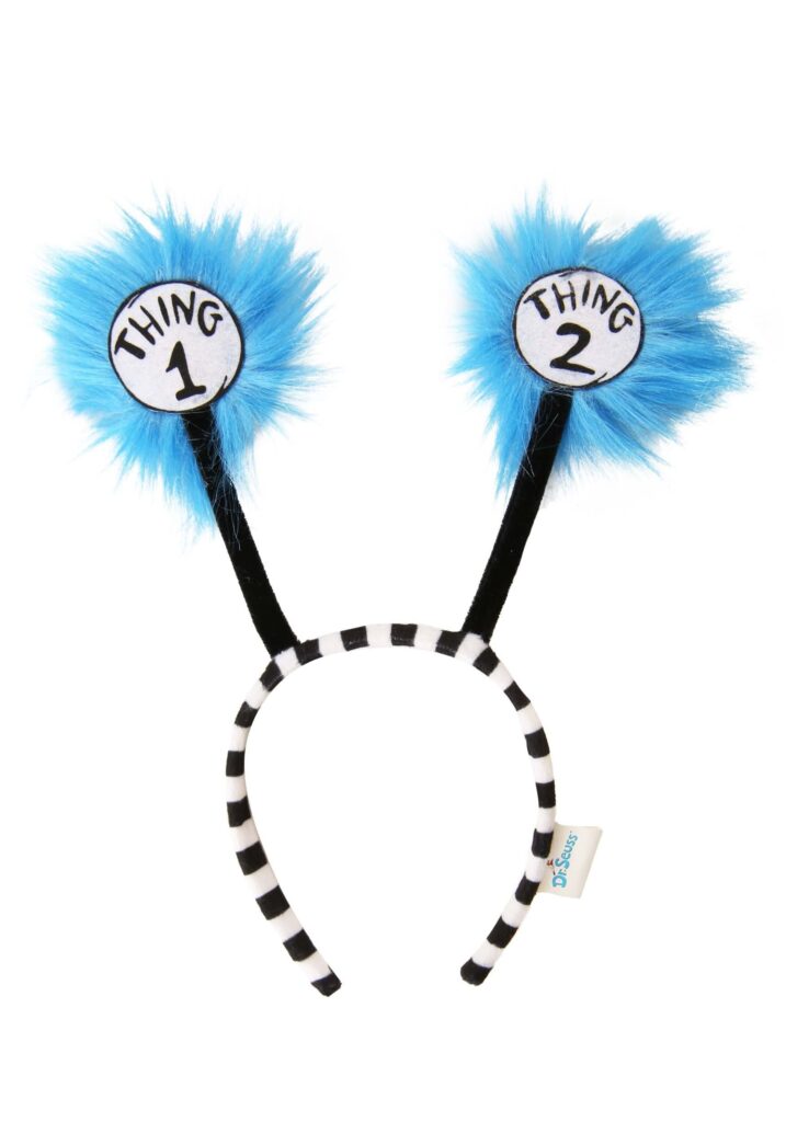 This piece is officially licensed and ready to take your storybook look to a whole new level. Striped black-and-white fabric covers the plastic headband, while a duo of antenna adorns the top, each with a Thing 1 or Thing 2 disc and a tuft of blue faux fur.
