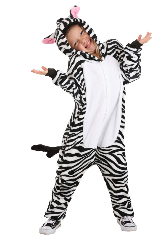 Zigging and ZaggingIn the wild, zebras use their stripes to avoid predators. Your toddler might not have to worry about lions but they do know a thing or two about escaping capture. All it takes are the words “diaper change” and the chase is on. Around couches, under tables… these kids know to get into spaces where it’s tough for a full-grown adult to fit. And the whole time, they’re laughing. If you want to honor your child’s gift for escape, this zebra onesie is a great choice. While your child’s zigging and zagging might be a far cry from the dramas of the African savanna, the zebra’s stripes suit your wild child perfectly!Costume DetailsZipping into this zebra costume is a whole lot of cozy fun. The soft costume has an oversized fit, sleeve cuffs, and pockets, making it a comfy choice for active kids who will want to use the costume for casual play. The suit zips up the front and has a hood topped with a sweet zebra face and pink lined ears. Complete with a saucy little tail in back, this zebra costume is ready to add a wild dose of fun to your home. Herd That Right!While one zebra costume is great, everyone knows that zebras travel in packs. Make this look a family costume when you check out our other sizes and styles. With something for everyone, there’s no reason the whole family can’t show up in all their striped glory!
