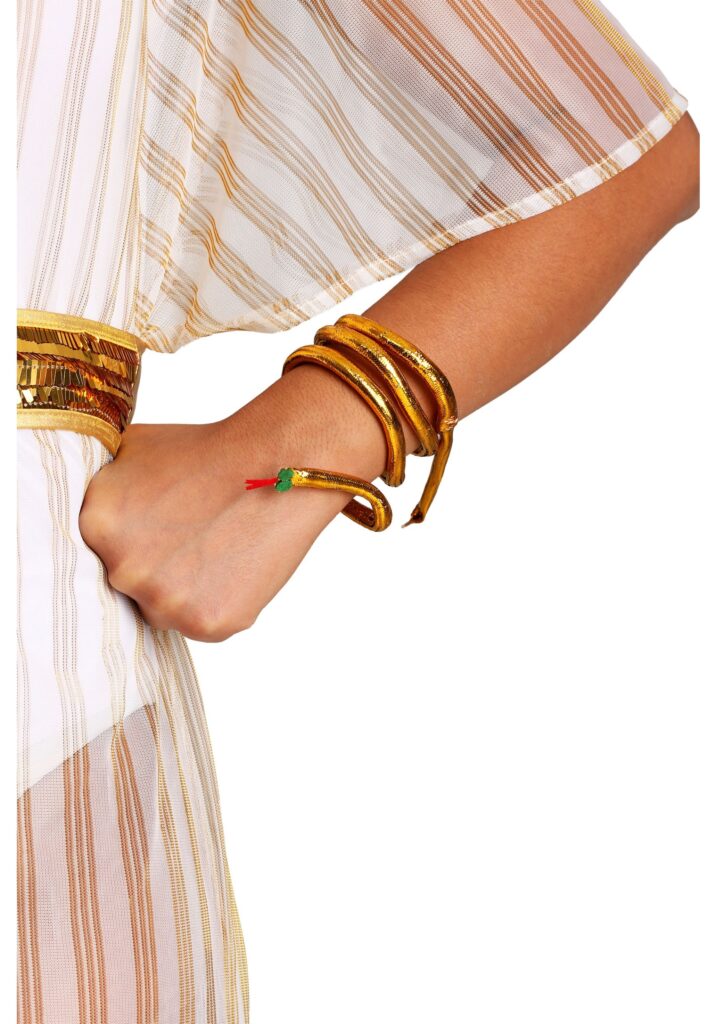 Product DetailsThis piece of gold costume jewelry fits quite easily around your wrist. It has sparkling green eyes set on the top along with a bright red tongue. You can pair it with your Queen Cleopatra costume to make you look like the ruler of the Nile, or you can just add it to your Medusa costume for a bit of added bling.Better Than the Real Thing!So, don’t be a silly goose trying to use a real snake as jewelry! Just use this easy bracelet to finish your glamorous look!