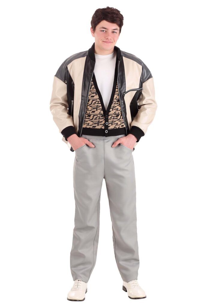 Design & DetailsOfficially licensed and exclusively made, this 3-part costume was created right in our design studio to be a replica of Matthew Broderick’s look from the film. It features Ferris’s infamous jacket, crafted of faux leather, with a black and tan color block pattern. The vest boasts the same bold 80s pattern of Ferris’s original, as well as a deep V silhouette and buttons in front. And the gray pants complete the transformation, leaving no question as to who you’re impersonating this Halloween.Danke SchoenRemember that when people compliment your appearance this holiday, you have two choices about how to respond. You can simply say “thank you” and smile, or you can do Ferris proud, and recreate a full-blown parade style performance to “Danke Schoen.”