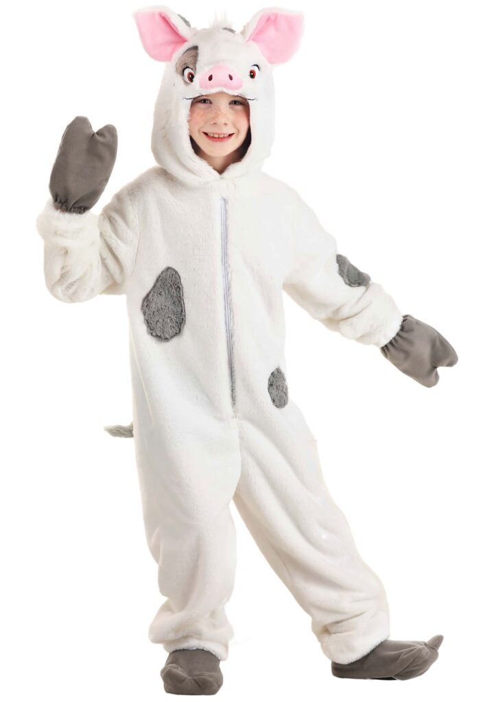 Design & DetailsHelp your kind kiddo get dressed for Halloween with our exclusive Disney Pua Children’s Costume from Disney’s Moana. The officially licensed ensemble transforms the wearer into the cuddliest companion with just three pieces. A white hooded jumpsuit starts the costume. Made from a super-soft material with appliqued spots like Pua’s and an attached tail, your child need only secure the front zipper to take on Pua’s precious appearance.Of course, guaranteeing your child looks like the Disney darling and not just any old pig, the attached hood features Pua’s big ears, bright pink snout, and small but bright brown eyes. The costume is completed with pairs of mittens and shoe-covers shaped like hooves, ensuring your little one is ready to march alongside Moana.
