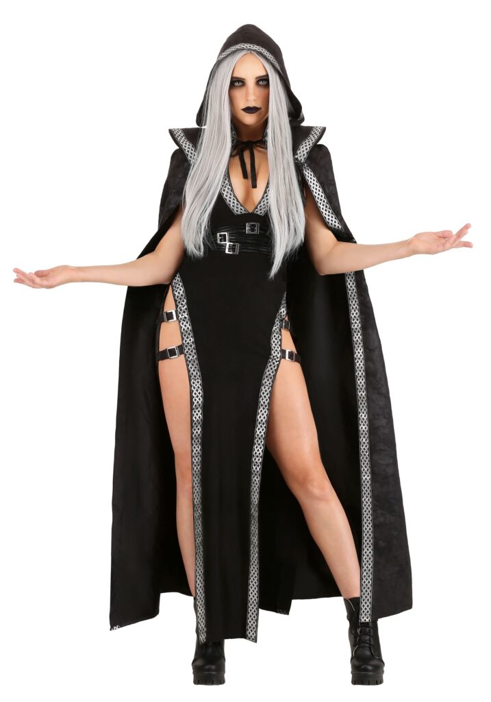 Out of the bog and into the SmogOnce upon a time, a long, long time ago, witches lived in swamps or deep in the woods. They were weathered from years of making potions for ungrateful customers in isolation. Now that it’s the modern era, all that has changed. Modern witches are sleek, fierce ard here to stay! These witches are serious entrepreneurs. Last weekend, we stopped in at this witch’s pop-up shop where she puts her cauldron skills to use making sparkling potions with modern uses. There’s a draft that you can serve to your friend before backing out of social engagements, and they’ll instantly forgive and forget. And a potion that will cure you of your social media addiction, this one is extra popular during finals week. It’s safe to say, we’re sold on their new, witchy upgrade!Details & DesignOf course, modern witches deserve a modern wardrobe. A wardrobe that alludes to their powerful past, while embraces their new metropolitan setting. That’s where this costume comes in! Designed by our in-house creative team, this flowy look is trimmed in silver brocade and accented with head-swiveling details. The dress, neck cowl, and cloak can be worn separately or together. The featured dress has attached faux-leather belts cinching the waist in while matching buckles add an edgy touch to the slits on the skirt. The hood has a heavier, aged leather texture with sculpted shoulders and a drooped hood that gives its wearer a mystical silhouette. Stop Staring and Start StarringIt’s time for the mystical folks to stop lingering in the shadows and take their fabulous place at the table, at least on Halloween night! Make the most of this magical costume with accessories such as the wet look gloves and futuristic staff featured in this photo. With a look as tough as this one, you can be sure that no one will take you for just any basic witch!