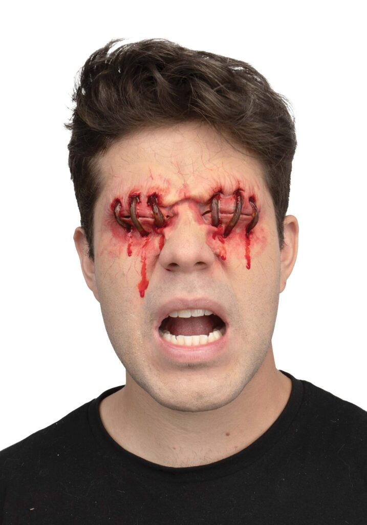 Product DetailsIt’s clear to see that you are committed to a gruesome Halloween look! This Voodoo Conjuring Applique will help you achieve your ghoulish goals. The latex prosthetics are molded to look like a pair of eyes that have been agonizingly stapled shut using rusty metal. Each opening in the “flesh” is puckered and red for extra ick factor. Once applied, have a helper add a little fake blood for the finishing touch (and then ask them to stick around to help you figure out where you’re going). Eye SpyLooking for a truly terrifying accessory? Look no further! Literally – this applique won’t allow you to look, but trust us, you’ll be amazing.