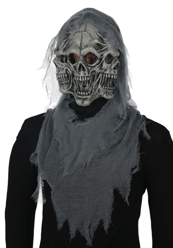 Product DetailsThe voices all agree that this exclusive Trio of Doom Mask for Adults is the perfect choice for Halloween! The molded vinyl face mask is attached to a jersey knit hood covered in gray cheesecloth. The mask is shaped like three squished-together skulls. Two of the three skulls have wide-open mouths, and the eye sockets serve as viewports. Three’s a CrowdThese three skulls only look as though they’ve taken over your body, in reality, you’ve chosen the perfect accessory for your costume, and you’re going to have a blast showing it off! The fact that your friends are going to have a hard time figuring out which set of eye sockets to look at is an extra perk. Have a blast with you and yours this holiday season, and check out this exclusive Trio of Doom Mask for Adults, made by us.